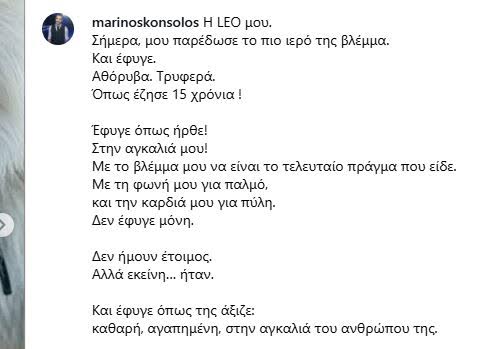 «Η LEO μου. Σήμερα, μου παρέδωσε το πιο ιερό της βλέμμα. Και έφυγε. Αθόρυβα. Τρυφερά. Όπως έζησε 15 χρόνια! Έφυγε όπως ήρθε! Στην αγκαλιά μου! Με το βλέμμα μου να είναι το τελευταίο πράγμα που είδε. Με τη φωνή μου για παλμό, και την καρδιά μου για πύλη. Δεν έφυγε μόνη. Δεν ήμουν έτοιμος. Αλλά εκείνη… ήταν. Και έφυγε όπως της άξιζε: καθαρή, αγαπημένη, στην αγκαλιά του ανθρώπου της. Για λίγο ακόμα μαζί της. Έτσι… ανάμεσα στους κόσμους. Εκεί που για λίγο η αγάπη και ο αποχωρισμός είναι το ίδιο πράγμα. Το ταξίδι στο Φως ξεκινάει! Σε ευχαριστώ, LEO μου. Για όλα» γράφει.