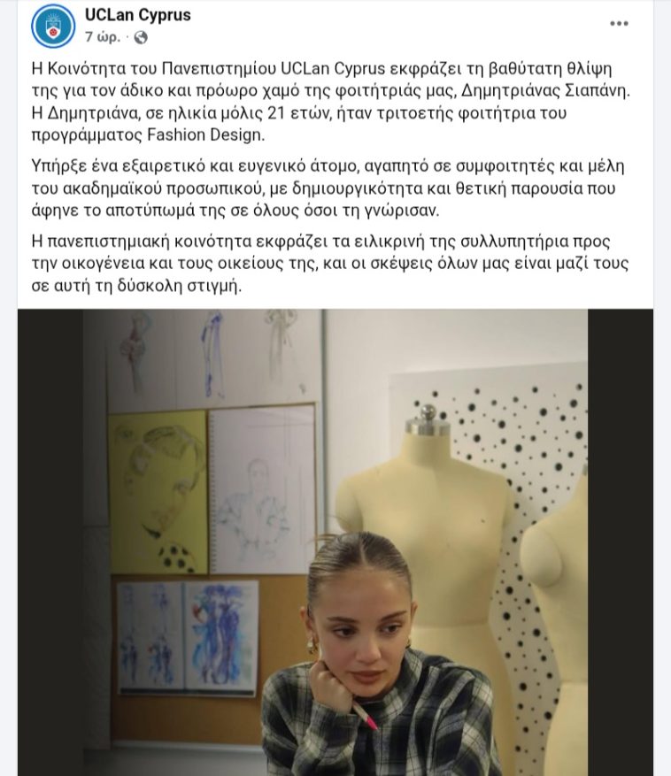 Από την πλευρά της, η Κοινότητα του Πανεπιστημίου UCLan Cyprus εκφράζει τη βαθύτατη θλίψη της για τον άδικο και πρόωρο χαμό της φοιτήτριάς μας, Δημητριάνας Σιαπάνη.