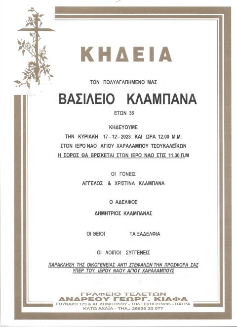 Η Πάτρα θρηνεί άλλον έναν. Νεκρός στα 36 ο Βασίλης Κλαμπανάς. Η κηδεία θα εκτελεστεί στις 17/12/2023 και ώρα 12:00 στον Ιερό Ναό Αγίου Χαραλάμπου Τσουκαλεϊκών.