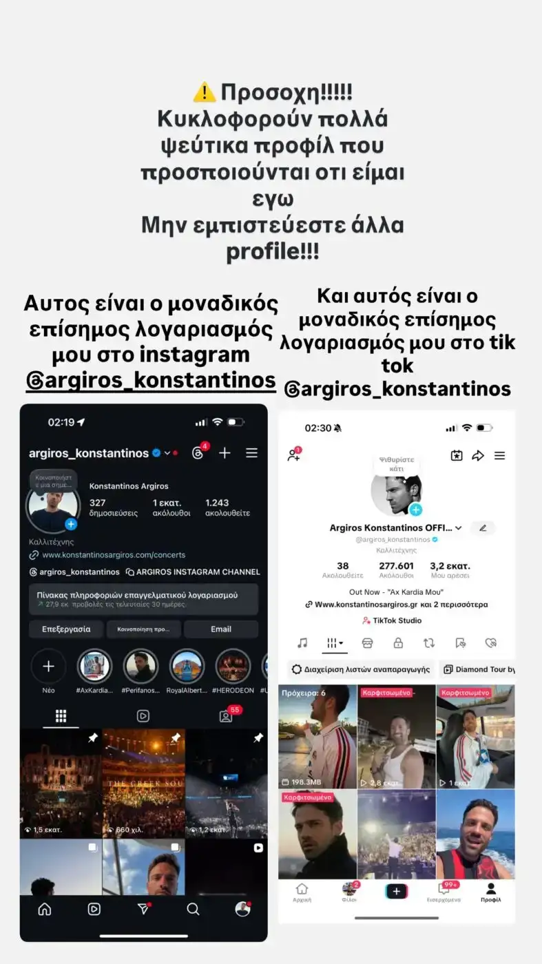 «Προσοχή!!! Κυκλοφορούν πολλά ψεύτικα προφίλ που προσποιούνται ότι είμαι εγώ. Μην εμπιστεύεστε άλλα προφίλ!!! Αυτός είναι ο μοναδικός λογαριασμός μου στο Instagram και αυτός είναι ο μοναδικός επίσημος λογαριασμός μου στο Tik Tok. Μην εμπιστεύεστε μηνύματα και αιτήματα από άλλους λογαριασμούς. Σας ευχαριστώ για την στήριξη», γράφει ο Κωνσταντίνος Αργυρός.
