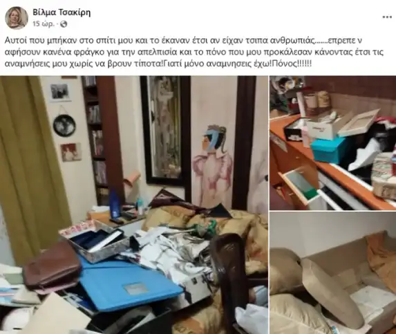 «Αυτοί που μπήκαν στο σπίτι μου και το έκαναν έτσι αν είχαν τσίπα ανθρωπιάς έπρεπε να αφήσουν κανένα φράγκο για την απελπισία και το πόνο που μου προκάλεσαν κάνοντας έτσι τις αναμνήσεις μου χωρίς να βρουν τίποτα. Γιατί μόνο αναμνήσεις έχω. Πόνος», έγραψε χαρακτηριστικά στη δημοσίευσή της η Βίλμα Τσακίρη.