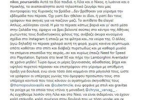 Όμως οι σκηνές ήταν λίγες και ο ηθοποιό εξηγεί το γιατί: «Αυτά τα δύο παιδιά, η Λίλα και ο Νίκος, η Ιωάννα και ο Ηρακλής, το ανεπανάληπτο αυτό τηλεοπτικό ζευγάρι που μας συντροφεύει της Κυριακής τα βράδια …δεν βρέθηκαν για γύρισμα την εβδομάδα που πέρασε. Όχι γιατί δεν ήθελαν οι ίδιοι, ή γιατί δεν τους γράφουν πια σκηνές για να παίζουν μαζί. Το αντίθετο θα έλεγα! Απλώς…κόλλησαν covid. Η μία το πέρασε κάπως βαριά και γι’ αυτό μέσα στην ζαλάδα της, έψαχνε να βρει βελουτέ σούπες στο κέντρο της Αθήνας ρωτώντας τους διαδικτυακούς φίλους της, ανέβαζε άκυρα κινούμενα σχέδια στο Instagram ή έπαιζε με τα φίλτρα και…τα νεύρα της. Ο άλλος (εγώ δηλαδή) το πέρασε χαλαρά αυτή τη φορά, χωρίς κανένα σύμπτωμα, οπότε καθόταν στο σπίτι και διάβαζε πυρετωδώς και με καθαρό μυαλό τα επόμενα επεισόδια της σειράς…αν και κυρίως έπαιζε Need for Speed στο Playstation. Έφτασε στο level 50 και πήρε την Lamborghini Aventador σε χρόνο μηδέν! Τώρα όμως οι μέρες ξεγνοιασιάς, αδιαθεσίας, βήχα και υψηλού πυρετού πέρασαν και επιστρέφουν στο γύρισμα με απύθμενη όρεξη για δουλειά, ενώ είναι τόσο όσο κομμένοι στα μάγουλά τους, ώστε να γράφουν οι υπέροχες γωνίες του όμορφου προσώπου τους, στα υπέροχα κοντινά που τους κάνουν οι αγαπημένοι σκηνοθέτες τους ενώ φοράνε με στυλ και τα ρούχα με τα οποία τους ντύνει η μοναδική Χρύσα.Ας ευχηθούμε λοιπόν στη Λίλα και στο Νίκο, να είναι σιδερένιοι, να έχουν καλή επάνοδο, καλή συνέχεια στην δουλειά που με τόσο μεράκι και εκ γενετής ταλέντο δημιουργούν και ας συντονιστούμε την Κυριακή στις 20:50 στο Star για να δούμε τα υπέροχα επεισόδια που έχουν ήδη γυρίσει!!!