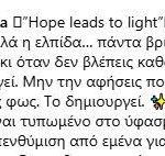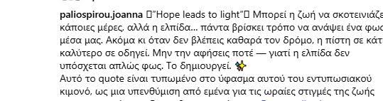 “Μπορεί η ζωή να σκοτεινιάζει κάποιες μέρες, αλλά η ελπίδα… πάντα βρίσκει τρόπο να ανάψει ένα φως μέσα μας. Ακόμα κι όταν δεν βλέπεις καθαρά τον δρόμο, η πίστη σε κάτι καλύτερο σε οδηγεί. Μην την αφήσεις ποτέ — γιατί η ελπίδα δεν υπόσχεται απλώς φως. Το δημιουργεί. Αυτό το quote είναι τυπωμένο στο ύφασμα αυτού του εντυπωσιακού κιμονό, ως μια υπενθύμιση από εμένα για τις ωραίες στιγμές της ζωής» αναφέρει!
