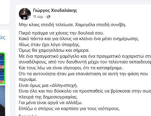 «Μην κλαις επειδή τελείωσε. Χαμογέλα επειδή συνέβη. Πικρό πράγμα να χάνεις την δουλειά σου. Κακό πάντα και για όλους να κλείνει ένα μέσο ενημέρωσης. Ιδίως όταν έχει λόγο ύπαρξης. Όμως θα χαμογελάσω και σήμερα. Με ένα πραγματικό χαμόγελο και ένα πραγματικό ευχαριστώ στους συναδέλφους, από τον διευθυντή μέχρι τον τελευταίο εκπαιδευόμενο. Και τους λέω να είναι σίγουροι, ότι τα καταφέραμε. Οτι τα αυτονόητα ήταν μια επανάσταση σε αυτή την φάση που περνάμε. Είναι όμως μια «άλλη» εποχή. Είναι όλο και πιο δύσκολο να προσπαθείς να βρίσκεσαι στην σωστή πλευρά της δημοσιογραφίας. Για μένα είναι αργά να αλλάξω. Ελπίζω ο σπόρος να καρπίσει για τους νεότερους. Σας φιλώ».