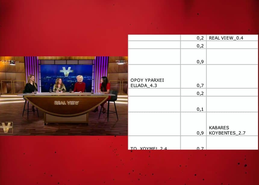 Συνήθως τα νούμερα τηλεθέασης της εκπομπής “Real View” μετά την μετακόμισή της απο την βρδινή ζώνη τα μεσημέρια… είναι ικανοποιητικά. Ικανοποιητικά σε σχέση με τον ανταγωνισμό… και με την μάχη του “πάτου”. Πολλές φορές είναι απο πάνω και απο το “Όπου Υπάρχει Ελλάδα” αλλά και απο τον Τσουρό.