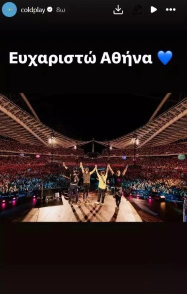 - Λίγο πριν την έναρξη της συναυλίας, με ανάρτησή τους στις επίσημες σελίδες τους στα social media, οι Coldplay είχαν γράψει: «Δεν είμαστε σίγουροι αν ο Αρχιμήδης θα μπορούσε να εξηγήσει γιατί μας πήρε τόσο πολύ καιρό να έρθουμε στην Ελλάδα… Όμως φτάνοντας στην Αθήνα έκανε την… Οδύσσειά μας τόσο γλυκιά! Ανυπομονούμε να παίξουμε απόψε στο πανέμορφο Ολυμπιακό Στάδιο». Λίγες ώρες μετά το τέλος της πρώτης συναυλίας τους στο ΟΑΚΑ που θα επαναληφθεί και απόψε (9/6), οι Coldplay ανέβασαν μία φωτογραφία από το event και έγραψαν στα ελληνικά: «Ευχαριστώ Αθήνα», θέλοντας έτσι να δείξουν την ευγνωμοσύνη τους για τη ζεστασιά που τους χάρισε το ελληνικό κοινό τους.