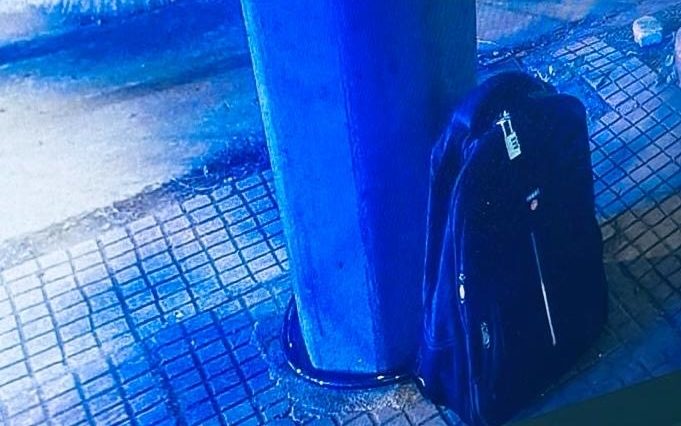 Φωτογραφία ντοκουμέντο με το σακίδιο που είχε μέσα στην βόμβα που έσκασε στα γραφεία της Hellenic Train στη λεωφόρο Συγγρού.
