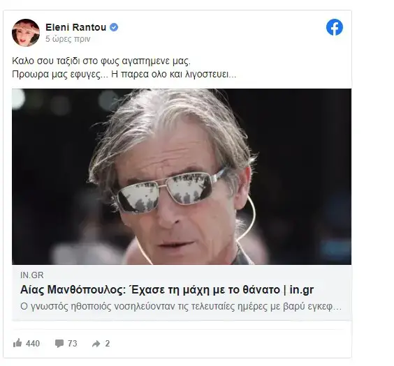 Λίγες ώρες μετά την επίσημη ανακοίνωση του νοσοκομείου για τον θάνατο του αγαπημένου ηθοποιού, η Ελένη Ράντου είπε το δικό της «αντίο» με μία σπαρακτική ανάρτηση στην επίσημη σελίδα της στο Facebook.