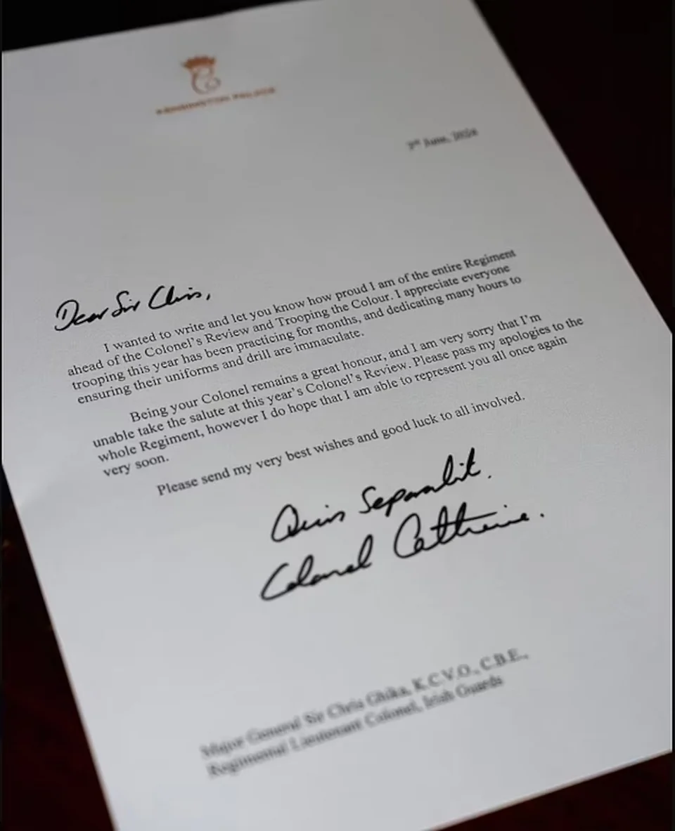 Την «εμφάνισή» της έκανε κατά κάποιον τρόπο η Κέιτ Μίντλετον ενόψει της σημερινής γενικής πρόβας για το Trooping The Colour της επόμενης εβδομάδας. Η πριγκίπισσα της Ουαλίας έγραψε ένα γράμμα ζητώντας συγγνώμη για την απουσία της από την επιθεώρηση της Ιρλανδικής φρουράς, ενώ συνεχίζει τις προληπτικές θεραπείες της στην μάχη κατά του καρκίνου. «Ελπίζω να είμαι σε θέση να σας εκπροσωπήσω όλους πολύ σύντομα», αναφέρει χαρακτηριστικά στην απολογητική επιστολή της ενώ τους εύχεται καλή επιτυχία.