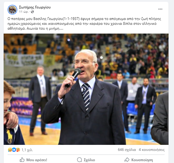 ” Ο πατέρας μου Βασίλης Γεωργίου (1-1-1937) έφυγε σήμερα το απόγευμα από την ζωή πλήρης ημερών, χαρούμενος και ικανοποιημένος από την καριέρα του χρόνια δίπλα στον ελληνικό αθλητισμό. Αιωνία του η μνήμη…”