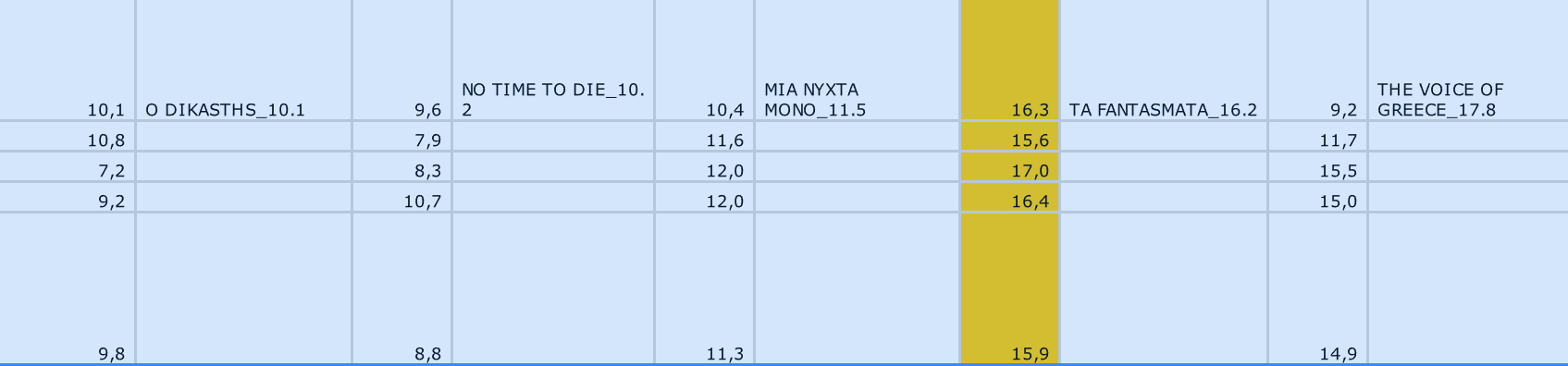 - Πάμε τώρα στα επιμέρους. Χθές παρότι ο Μαρκουλάκης και ο Δικαστής έκαναν πρεμιέρα εντούτις το κοινό δεν άλλαξε συνήθειες. Με το ζότι η πανάκριβη σειρά του αντ1 έπιασε 10% ενώ τα “Φαντάσματα” κατάφεραν την ώρα που έπαιζαν να καταταγούν στην πρώτη θέση με το Voice τελικά να καταλμβάει την τελική πρωτιά σε μέσο όρο τηλεθέασης.