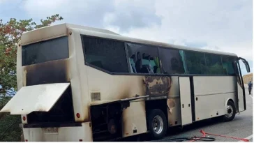 Για την κατάσβεσή της φωτιάς στο λεωφορείο επιχειρούν 12 πυροσβέστες με 5 οχήματα και εθελοντές.