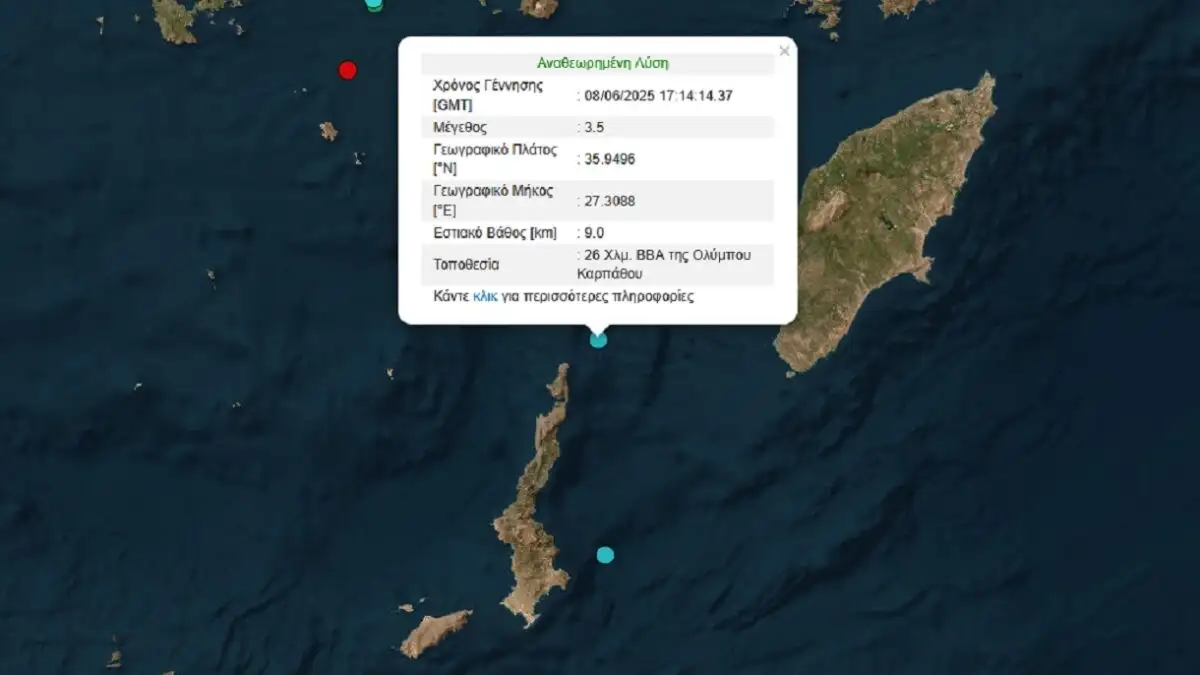 Σεισμός 3,5 Ρίχτερ σημειώθηκε το απόγευμα της Κυριακής (08/06/2025) στη θαλάσσια περιοχή ανάμεσα στην Κάρπαθο και τη Ρόδο.