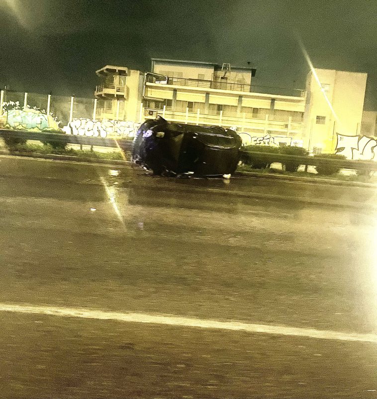 - Το όχημα που φαίνεται να μην έχει συγκρουστεί με άλλο, αναποδογύρισε και έμεινε στα δύο όρθιο σε πλαϊνή θέση.