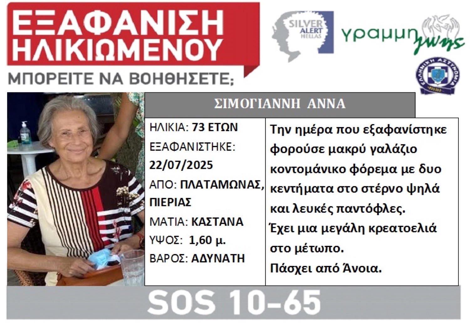 Τραγική ήταν η κατάληξη στην υπόθεση εξαφάνισης της 73χρονης Άννας Σιμογιάννη, η οποία αγνοούταν από την Τρίτη 22 Ιουλίου, όταν χάθηκαν τα ίχνη της από το εξοχικό της στον Πλαταμώνα Πιερίας.