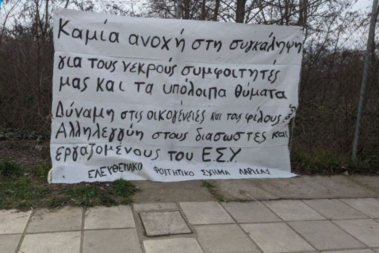 «Καμία ανοχή στη συγκάλυψη για τους νεκρούς συμφοιτητές μας και τα υπόλοιπα θύματα. Δύναμη στις οικογένειες και τους φίλους τους. Αλληλεγγύη στους διασώστες και τους εργαζομένους του ΕΣΥ» αναφέρει πανό που έχει τοποθετηθεί έξω από το Νοσοκομείο Λάρισας.