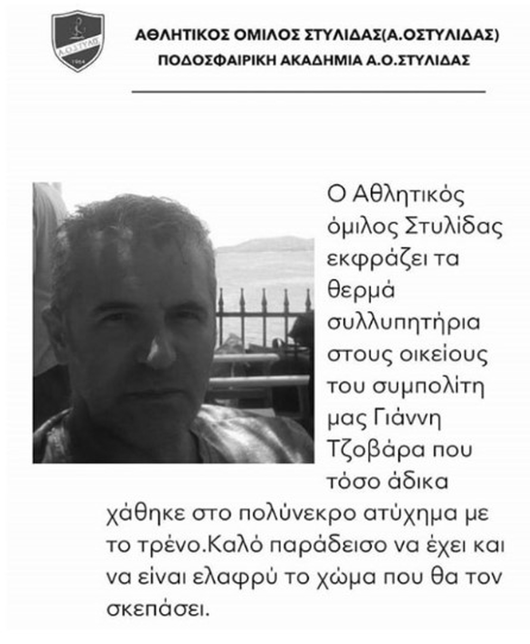 “Ο Αθλητικός Όμιλος Στυλίδας εκφράζει τα θερμά συλλυπητήρια στους οικείους του συμπολίτη μας Γιάννη Τζοβάρα που τόσο άδικα χάθηκε στο πολύνεκρο ατύχημα με το τρένο. Καλό παράδεισο να έχει και να είναι ελαφρύ το χώμα που θα τον σκεπάσει”, έγραψε ο Αθλητικός Όμιλος Στυλίδας.
