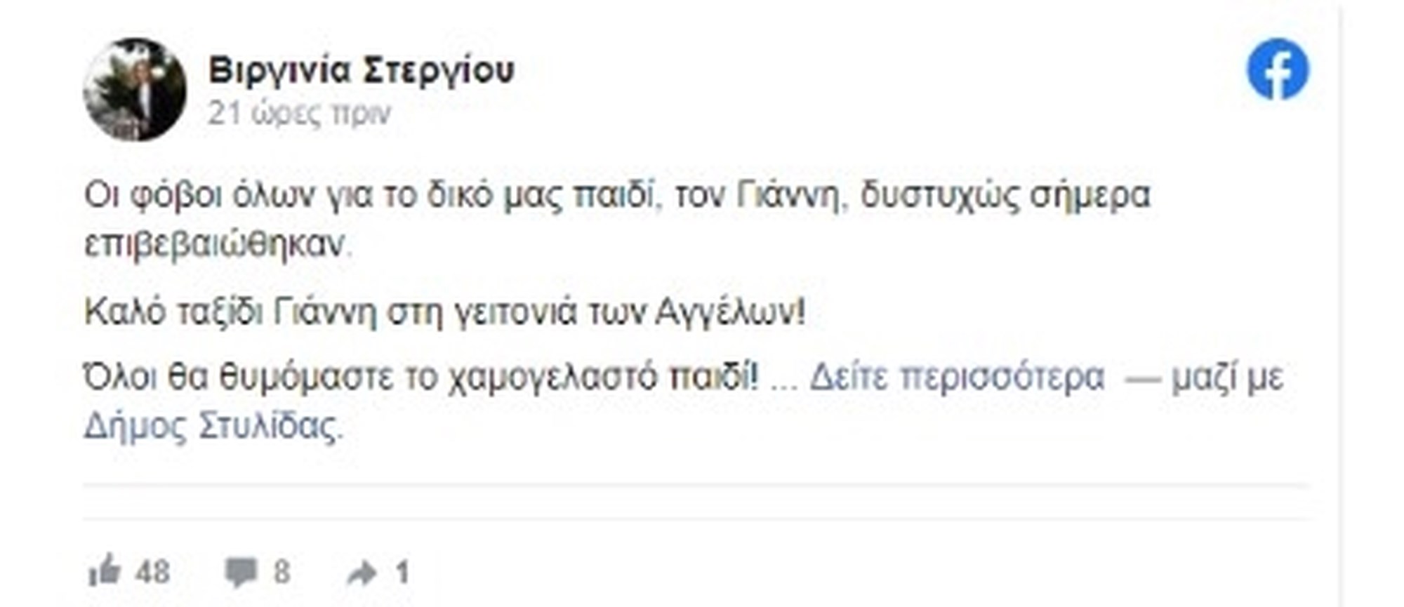 - “Οι φόβοι όλων για το δικό μας παιδί, τον Γιάννη, δυστυχώς σήμερα επιβεβαιώθηκαν….”, έγραψε σε ανάρτησή της η Δήμαρχος Στυλίδας Βιργινία Στεργίου.