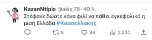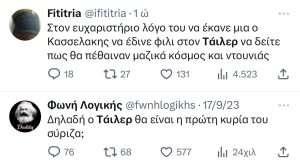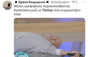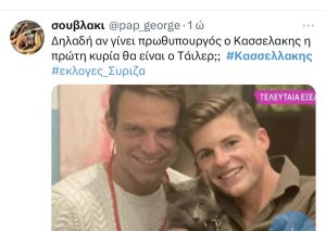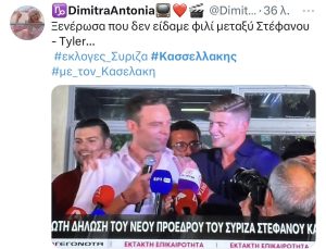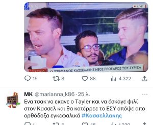 Αυτό που ήθελαν όλοι ήταν το φιλί που δεν ήρθε!!! Σας μεταφέρω μερικά με χιούμορ φυσικά και όχι για να κρίνουμε τις προτιμήσεις του Κασσελάκη «Στέφανε δώσε κανα φιλί να πάθει εγκεφαλικό η μισή Ελλάδα» «Δηλαδή αν γίνει πρωθυπουργός ο Κασεσελάκης, η πρώτη κυρία είναι ο Τάυλερ;» «Και τα φτιάνει λέει στο τέλος ο Πολάκης με τον Ταίλελ». Ρε τι πάθαμε!