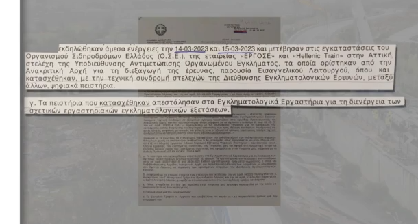 Την ίδια ώρα, αποκαλύπτεται με άλλο έγγραφο πως 4 μήνες μετά τη σύγκρουση των δύο τρένων, στις 28 Ιουνίου του 2023, έχει συνταχθεί μία έκθεση εργαστηριακής πραγματογνωμοσύνης από τη Διεύθυνση Εγκληματολογικών Ερευνών.