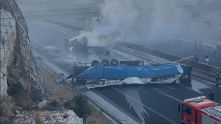 Στιγμές τρόμου έζησαν οι οδηγοί στην εθνική οδό Αθηνών Κορίνθου στα Μέγαρα στο ρεύμα προς Αθήνα καθώς μια νταλίκα ανατράπηκε και στη συνέχεια έπιασε φωτιά.