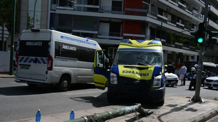 Το τροχαίο ατύχημα σημειώθηκε, όταν ιδιωτικό ασθενοφόρο συγκρούστηκε αρχικά με ένα αυτοκίνητο και στη συνέχεια, έπεσε πάνω σε κολόνα φωτισμού στο Παγκράτι και συγκεκριμένα στη οδό Βασιλέως Κωνσταντίνου στο ρεύμα προς Χίλτον.