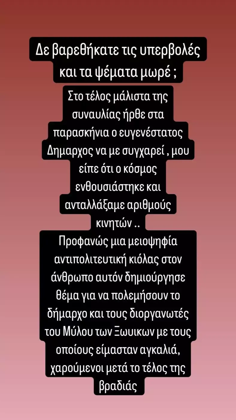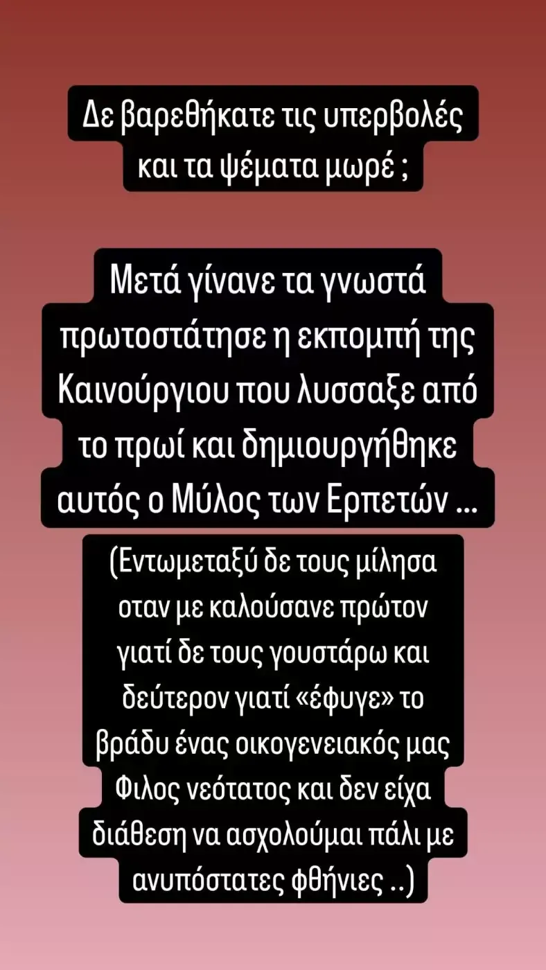 «Μετά γίνανε τα γνωστά, πρωτοστάτησε η εκπομπή της Καινούργιου που λύσσαξε από το πρωί και δημιουργήθηκε ο Μύλος των Ερπετών. Εν τω μεταξύ δεν τους μίλησα όταν με καλούσαν, πρώτον γιατί δεν τους γουστάρω και δεύτερον γιατί «έφυγε» το βράδυ ένας οικογενειακός φίλος νεότατος και δεν είχα διάθεση να ασχολούμαι πάλι με ανυπόστατες φθήνιες», έγραψε