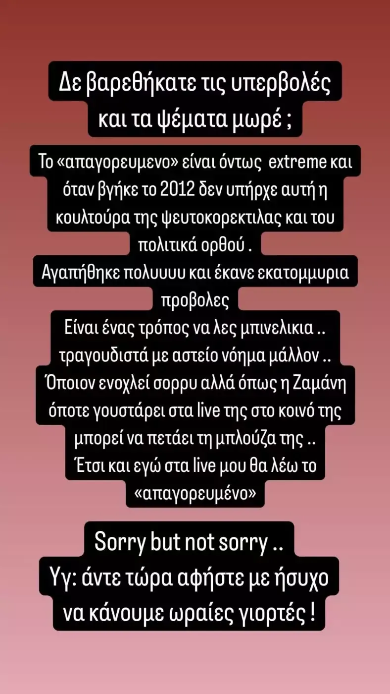 «Δεν βαρεθήκατε τις υπερβολές και τα ψέματα μωρέ; Στο χθεσινό υπέροχο live στον Μύλο Των Ξωτικών αυτό ακριβώς έγινε. Μου ζήτησε ο κόσμος και είπα το «απαγορευμένο». Το πρώτο μισάωρο κιόλας της συναυλίας. Ούτε διαμαρτυρήθηκε κανείς, ούτε έμεινε κανένας αποσβολωμένος, ούτε θύμωσε ο Δήμαρχος. Όλα ψέματα».