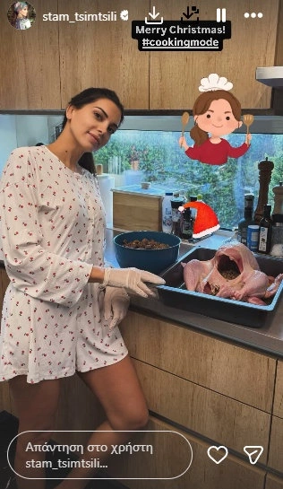 Η Σταματίνα επέλεξε να κρατήσει την παράδοση ζωντανή, ετοιμάζοντας γεμιστή γαλοπούλα, ενώ η χαρά της να φροντίζει τους δικούς της ήταν εμφανής. Χωρίς επαγγελματικές υποχρεώσεις λόγω γιορτών, η ημέρα αποτέλεσε την τέλεια αφορμή για να προσφέρει στην οικογένειά της ένα πλούσιο και γιορτινό γεύμα.