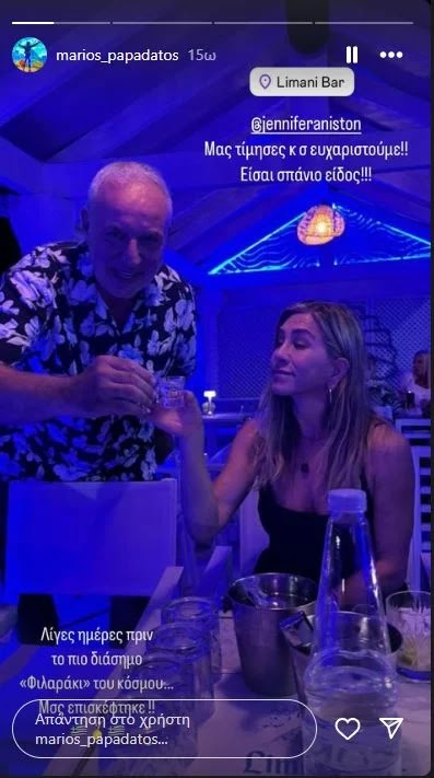 Μέσα από ένα Instagram story, που έκανε την Κυριακή (18/08) ο γνωστός μάνατζερ, Μάριος Παπαδάτος «προδόθηκε» το ταξίδι της Άνιστον στην Ελλάδα, αλλά και τα νυχτοπερπατήματά της.