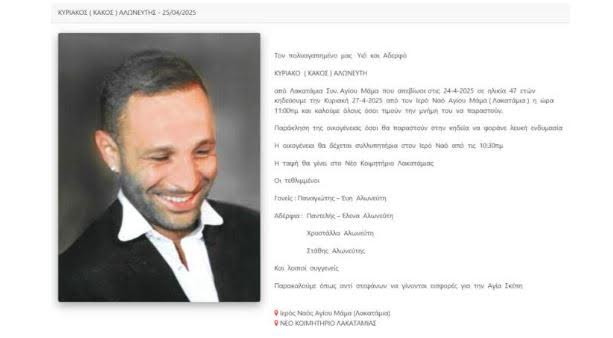 Συγκεκριμένα η ανακοίνωση αναφέρει: «Τον πολυαγαπημένο μας Υιό και Αδερφό ΚΥΡΙΑΚΟ (ΚΑΚΟΣ) ΑΛΩΝΕΥΤΗ από Λακατάμια Συν. Αγίου Μάμα που απεβίωσε στις 24-4-2025 σε ηλικία 47 ετών κηδεύουμε την Κυριακή 27-4-2025 από τον Ιερό Ναό Αγίου Μάμα (Λακατάμια) η ώρα 11:00πμ και καλούμε όλους όσοι τιμούν την μνήμη του να παραστούν.