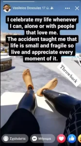«Η μητέρα μου το είχε δει και σε όνειρο. Ξύπνησε πολύ αναστατωμένη και είχε απορία να μάθει που βρισκόμαστε γιατί είχαμε αργήσει. Έτσι έμαθε τι είχε συμβεί.Στη συνέχεια έγιναν πάρα πολλές επεμβάσεις. Στην αρχή έπρεπε να σταθεροποιηθούν τα κόκαλα μέσα στα πόδια και μετά έπρεπε να έρθω απευθείας Αθήνα για να γίνουν συμμαζέματα. Δύτες έπεσαν μέσα στη θάλασσα και βρήκαν το χέρι. Αν ήταν σε ποταμίσιο νερό δεν θα είχαν πρόβλημα, θα ήταν πιο αναπτυγμένο αλλά το θαλασσινό νερό κάνει ζημιά.Ακολούθησε το ταξίδι στην Αμερική, στο κέντρο αποκατάστασης. Μια μεγάλη εμπειρία. Έτσι το είδα. Εκεί γνώρισα ξεχωριστούς ανθρώπους. Έχω κάνει φίλους με τους οποίους ακόμα και σήμερα κρατάμε επαφή».