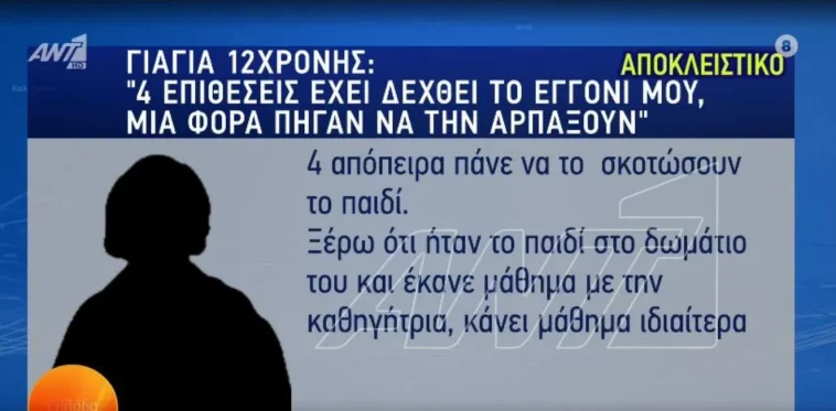 - Στην εκπομπή «Καλημέρα Ελλάδα», μίλησε αποκλειστικά και η γιαγιά της 12χρονης, καταγγέλλοντας πως η εγγονή της έπεσε θύμα απόπειρας απαγωγής