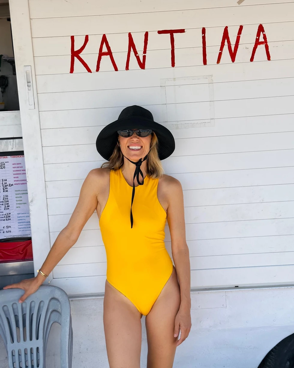 Φορώντας ένα ολόσωμο κίτρινο μαγιό και καπέλο, η ίδια φαίνεται να διασκεδάζει, να παίζει, να τρέχει, να ποζάρει σε μία καντίνα σαν παιδί!