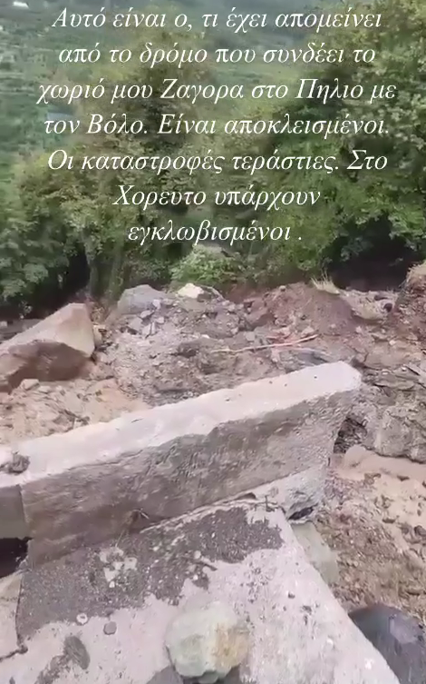 «Αυτό είναι ότι έχει απομείνει από το δρόμο που συνδέει το χωριό μου, Ζαγόρα στο Πήλιο με τον Βόλο. Είναι αποκλεισμένοι. Οι καταστροφές τεράστιες. Στο Χορευτό υπάρχουν εγκλωβισμένοι.»! έγραψε αρχικά η Βίκυ Βολιώτη και συνέχισε δείχνοντας εικόνα με τον κατεστραμμένο δρόμο: «Πρέπει να σταλεί άμεσα βοήθεια για τον απεγκλωβισμό των ανθρώπων.