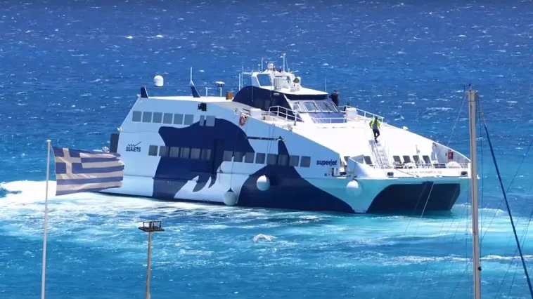 Το ταχύπλοο επιβατηγό – οχηματαγωγό πλοίο «Superjet» πλησιάζει στα Κουφονήσια, αλλά οι θυελλώδεις άνεμοι που πνέουν δυσχεραίνουν πολύ την πρόσδεσή του.