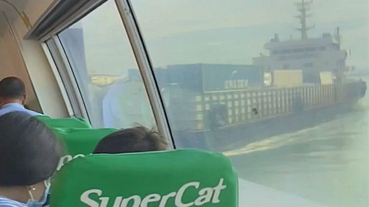 Πλάνα που τραβήχτηκαν από επιβάτη απαθανατίζουν την στιγμή όταν το φέρι Άγιος Ιεγουδιήλ έπεσε πάνω στο εμπορικό Ποσειδών, τινάζοντας τους επιβάτες από τα καθίσματα τους.
