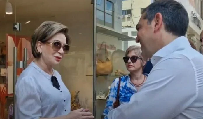 Ο πρόεδρος του ΣΥΡΙΖΑ συνομιλώντας με καταστηματάρχες και πολίτες στην οδό Ερμού, συναντά μια κυρία, η οποία σταματά να τον χαιρετήσει.