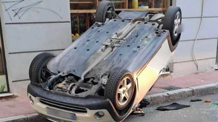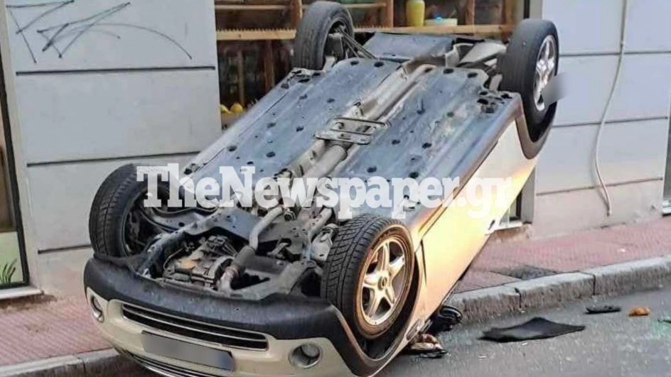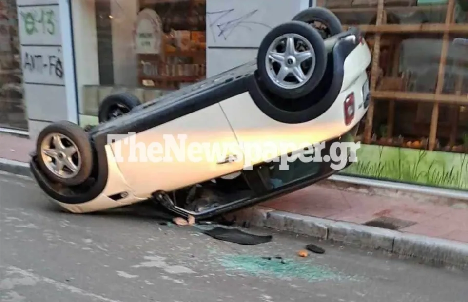 Σοκαριστικές είναι οι εικόνες οχήματος που αναποδογύρισε μετά από τροχαίο στο κέντρο του Βόλου το Σάββατο.