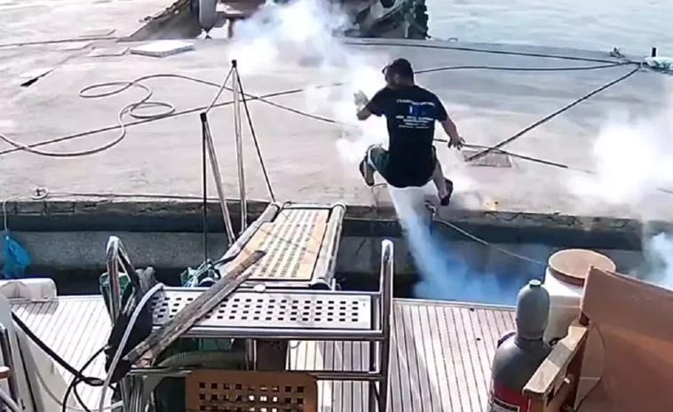 Ο άνδρας κρατούσε στο χέρι και επεξεργαζόταν τον πυροσβεστήρα, ο οποίος όμως έσκασε ξαφνικά στα χέρια του και τον πέταξε στη θάλασσα, χωρίς ευτυχώς να τραυματιστεί.