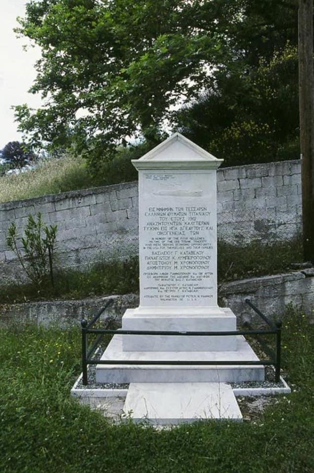 Η επιτύμβια πλάκα αναφέρει «Εις μνημην των τεσσάρων θυμάτων του Τιτανικού του έτους 1912 Αναζητούντων καλύτεραν τυχην εις ΗΠΑ δί εαυτούς και οικογενειας των».