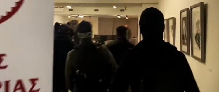 Ειδικότερα, οι κατηγορούμενοι από κοινού με οκτώ ακόμη αγνώστους συνεργούς τους, ενεργώντας ως ομάδα με ενωμένες δυνάμεις και εθνικιστικά κίνητρα και έχοντας καλυμμένα τα χαρακτηριστικά του προσώπου τους πραγματοποίησαν παρέμβαση επικολλώντας έντυπο υλικό και καλώντας επιτακτικά τον καλλιτέχνη να τερματίσει τη λειτουργία της έκθεσης.