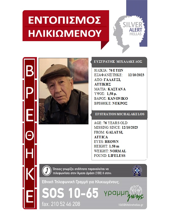 Ο Ευστράτιος Μιχαλακέλος, 76 ετών, είχε εξαφανίστεί από το σπίτι του, στο Γαλάτσι Αττικής, την προηγούμενη Πέμπτη. Η ΓΡΑΜΜΗ ΖΩΗΣ, ειδοποιήθηκε από τους οικείους του το βράδυ της 13/10/2023 και μετά την συγκέντρωση των απαιτούμενων δικαιολογητικών, ενεργοποίησε τον Κοινωνικό Συναγερμό SILVER ALERT, για την κινητοποίηση όλων για την ανεύρεσή του.