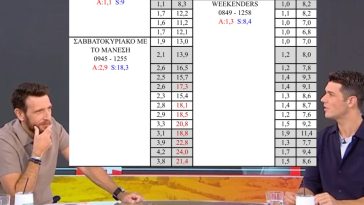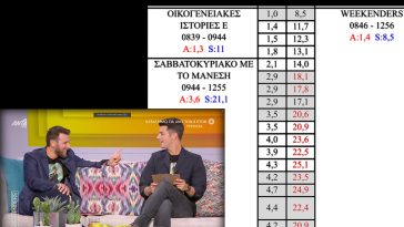 Αλήθεια γνωρίζετε πόσες τηλεοράσεις είναι ανοιχτές και δή των ηλικιακών μονάδων απο τα 18 μέχρι τα 54 χρόνια; Μερικές δεκάδες χιλιάδες τα Σαββατοκύριακα.