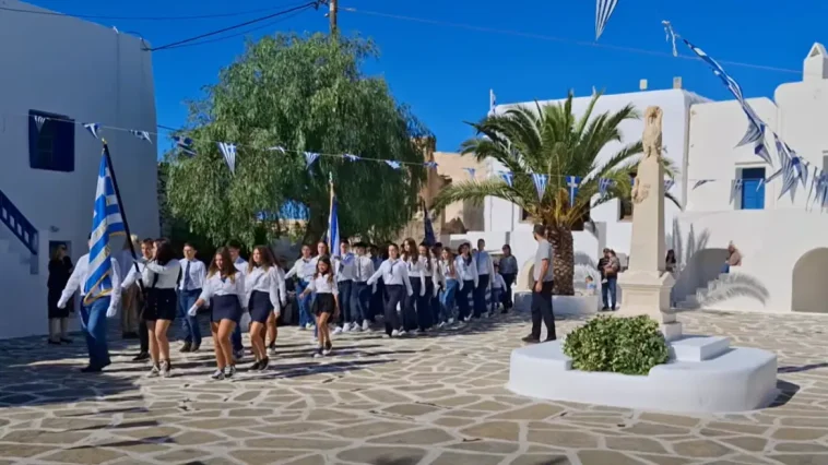 Στη Σίκινο οι μαθητές νηπιαγωγείου – δημοτικού – γυμνασίου και λυκείου ανέρχονται σε 14, αλλά στη φετινή παρέλαση για την εθνική επέτειο της 28ης Οκτωβρίου είχαν καλή παρέα: Συμμαθητές τους από το δεύτερο Γυμνάσιο Ελληνικού.