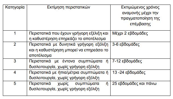 - Ο Διευθυντής Ιατρικής Υπηρεσίας ορίζεται ως υπεύθυνος για την κατάρτιση και λειτουργία της Λίστας. Κάθε θεράπων χειρουργός συμπληρώνει σε πρότυπο ηλεκτρονικό έντυπο του συστήματος όλα τα απαραίτητα στοιχεία για τη δημιουργία της εγγραφής ασθενούς στην Ενιαία Λίστα Χειρουργείων, στην οποία περιλαμβάνεται και η ανάλογη τεκμηρίωση, ανεξάρτητα αν η κλινική εκτίμηση έγινε κατά την πρωινή ή την ολοήμερη λειτουργία του νοσοκομείου. Σε περίπτωση που το περιστατικό κατά το χρονικό διάστημα αναμονής της χειρουργικής επέμβασης παρουσιάσει επιπλοκές και κρίνεται σοβαρότερο από άλλο περιστατικό της ίδιας κατηγορίας, έτσι ώστε να απαιτείται η μετακίνηση του στη Λίστα με αλλαγή της προγραμματισμένης ημερομηνίας της χειρουργικής επέμβασης ή αλλαγής της κατηγορίας σοβαρότητας της νόσου είτε η έξοδος του από αυτή, ο/η υπεύθυνος/η ιατρός ενημερώνει σχετικά, συμπληρώνοντας υποχρεωτικά την ίδια ημέρα που πραγματοποιείται η κλινική εκτίμηση, τα σχετικά στοιχεία του πρότυπου ηλεκτρονικού εντύπου. Κάθε θεράπων χειρουργός, μετά την κλινική εκτίμηση της κατάστασης κάθε ασθενούς του, αξιολογεί τη σοβαρότητα της νόσου, κατατάσσει το περιστατικό σύμφωνα με ακόλουθο πίνακα: