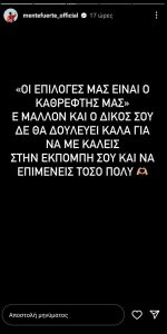 «Εγώ σας είπα από εδώ και πέρα δε θα αφήνω τίποτα να πέσει κάτω. Οι απόψεις είναι σαν τις κ@λοτρ@π@δες. Όλοι έχουμε μία. Έχουμε και εμείς στοματάκι, απλά δεν το ανοίγουμε χωρίς λόγο» έγραψε αρχικά ο Mente Fuerte, ενώ σχετικά με την ατάκα της Δανάης Μπάρκα για τη Μαρία Σολωμού: «οι επιλογές μας είναι ο καθρέφτης μας», ο ράπερ σχολίασε: «Ε μάλλον και ο δικός σου δε θα δουλεύει καλά για να με καλείς στην εκπομπή σου και να επιμένεις τόσο πολύ».