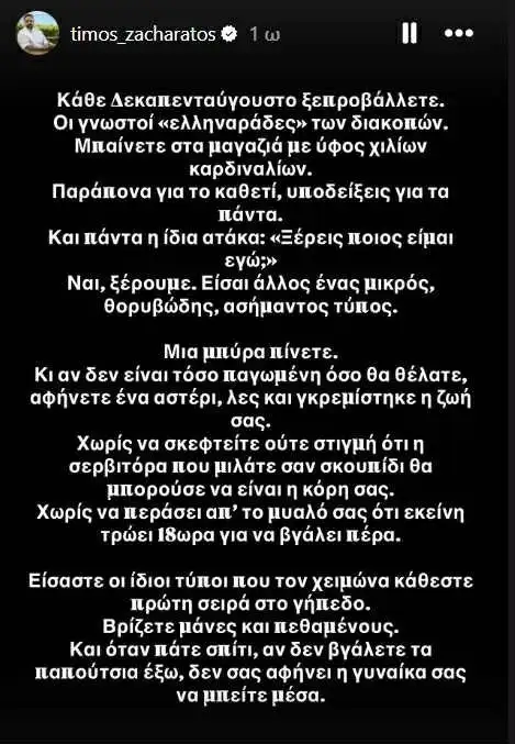 Μια μπύρα πίνετε και, αν δεν είναι τόσο παγωμένη όσο θα θέλατε, αφήνετε ένα αστέρι, λες και γκρεμίστηκε η ζωή σας. Χωρίς να σκεφτείτε ούτε στιγμή ότι η σερβιτόρα που μιλάτε σαν σκουπίδι θα μπορούσε να είναι κόρη σας. Χωρίς να περάσει απ’ το μυαλό σας ότι εκείνη τρώει 18ωρα για να τα βγάλει πέρα», έγραψε χαρακτηριστικά ο Τίμος Ζαχαράτος.