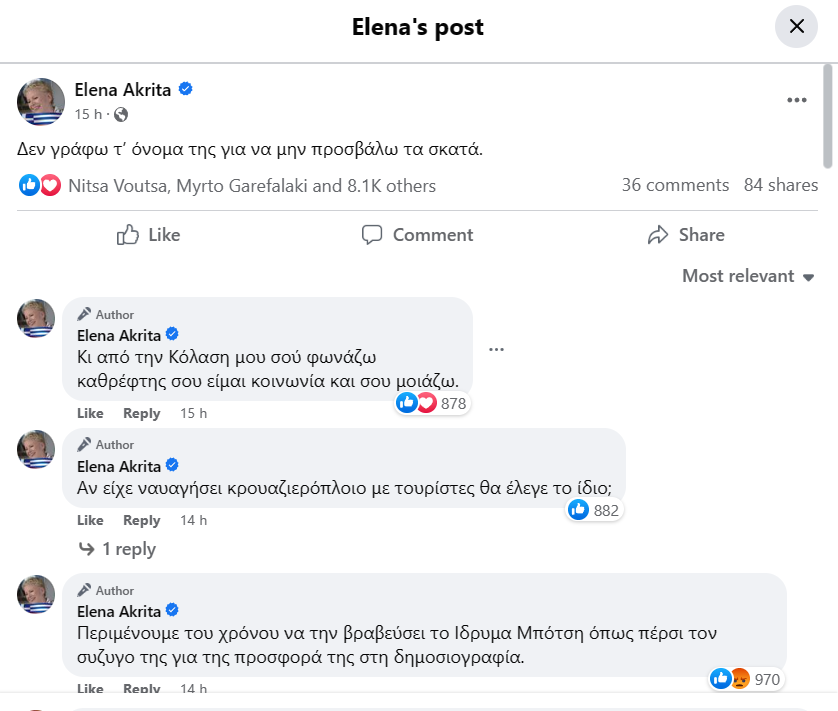 Αρχικά η Έλενα Ακρίτα έγραψε σε ποστ της στο facebook: «Δεν γράφω τ’ όνομα της για να μην προσβάλω τα σκατά». Και πρόσθεσε: «Αν είχε ναυαγήσει κρουαζιερόπλοιο με τουρίστες θα έλεγε το ίδιο; Περιμένουμε του χρόνου να την βραβεύσει το Ίδρυμα Μπότση όπως πέρσι τον σύζυγό της για της προσφορά της στη δημοσιογραφία».