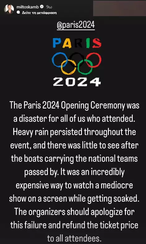 Ο Μίλτος Καμπουρίδης, από την πλευρά του, ανέφερε: «Η Τελετή Έναρξης των Ολυμπιακών Αγώνων Παρίσι 2024 ήταν καταστροφή για όλους εμάς που παρευρεθήκαμε. Ισχυρή βροχή επέμεινε καθ’ όλη τη διάρκεια της διοργάνωσης, και δεν υπήρχε τίποτα να δούμε μετά το πέρασμα των πλοιαρίων που μετέφεραν τις εθνικές ομάδες. Ήταν ένας πανάκριβος τρόπος να δεις ένα μέτριο σόου σε μια οθόνη, ενώ γίνεσαι μούσκεμα. Οι διοργανωτές θα πρέπει να ζητήσουν συγγνώμη για αυτή την αποτυχία και να επιστρέψουν την τιμή του εισιτηρίου σε όλους τους παρευρισκόμενους».